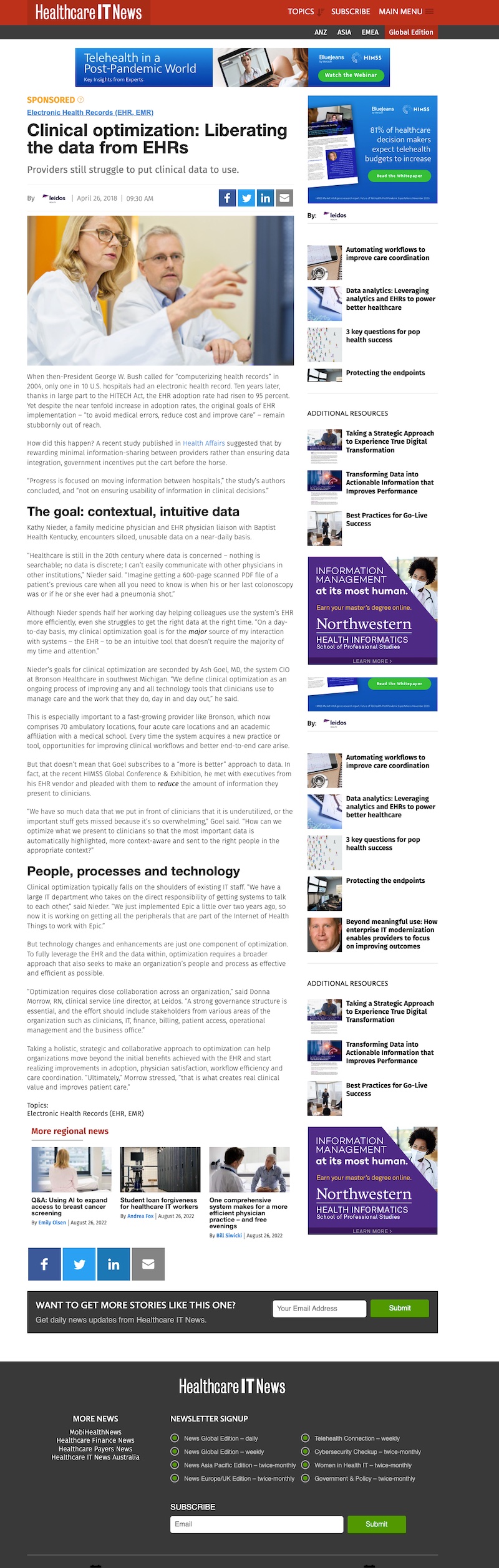 Nieder’s goals for clinical optimization are seconded by Ash Goel, MD, the system CIO at Bronson Healthcare in southwest Michigan. “We define clinical optimization as an ongoing process of improving any and all technology tools that clinicians use to manage care and the work that they do, day in and day out,” he said.