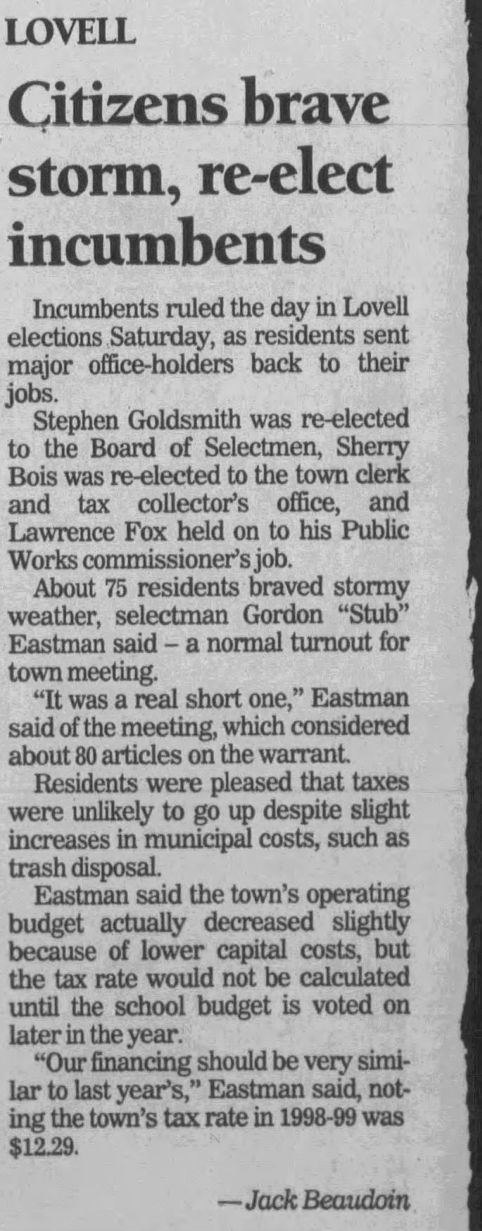 citation: “Lovell Citizens brave storm, re-elect incumbents” Newspapers.com, Portland Press Herald, March 7, 1999, https://pressherald.newspapers.com/article/portland-press-herald-lovell-citizens-br/127866450/