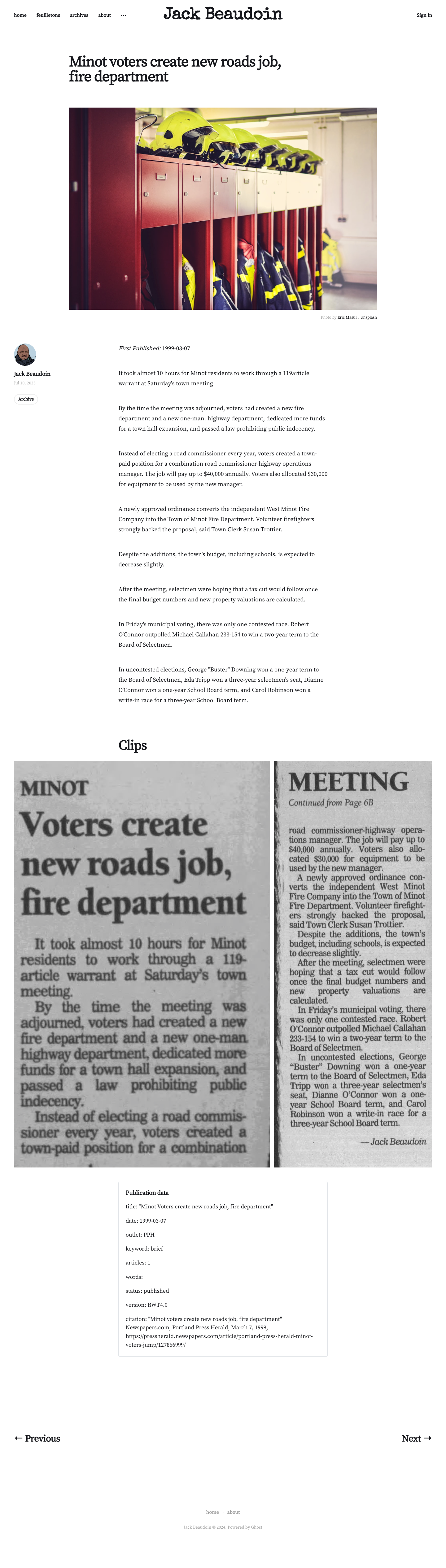 citation: “Minot voters create new roads job, fire department” Newspapers.com, Portland Press Herald, March 7, 1999, https://pressherald.newspapers.com/article/portland-press-herald-minot-voters-creat/127866844/, https://pressherald.newspapers.com/article/portland-press-herald-minot-voters-jump/127866999/
