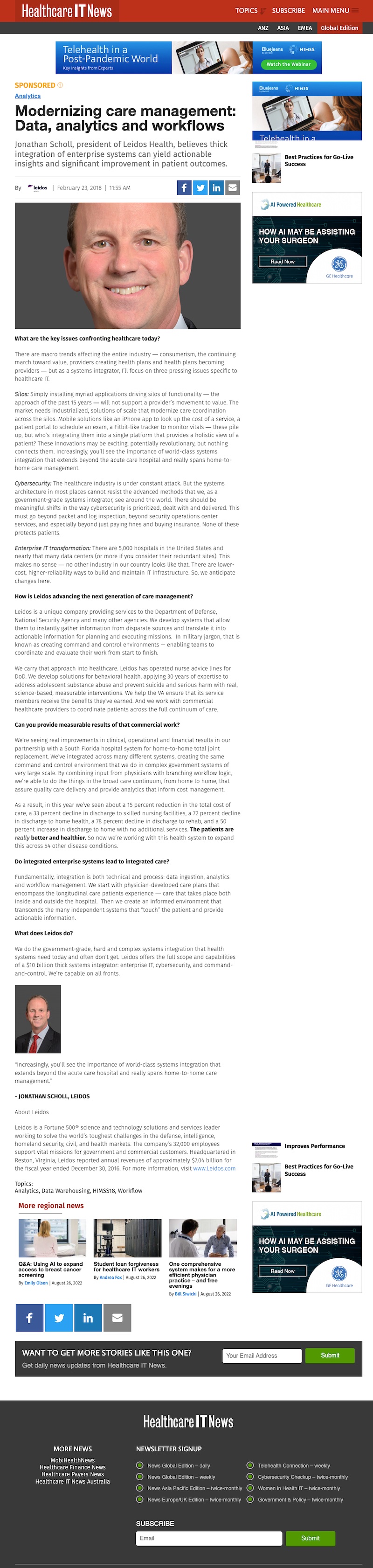 Jonathan Scholl, president of Leidos Health, believes thick integration of enterprise systems can yield actionable insights and significant improvement in patient outcomes. In this interview, Scholl maps out opportunities to overcome data silos, build cybersecurity assets and undertake enterprise IT transformation.