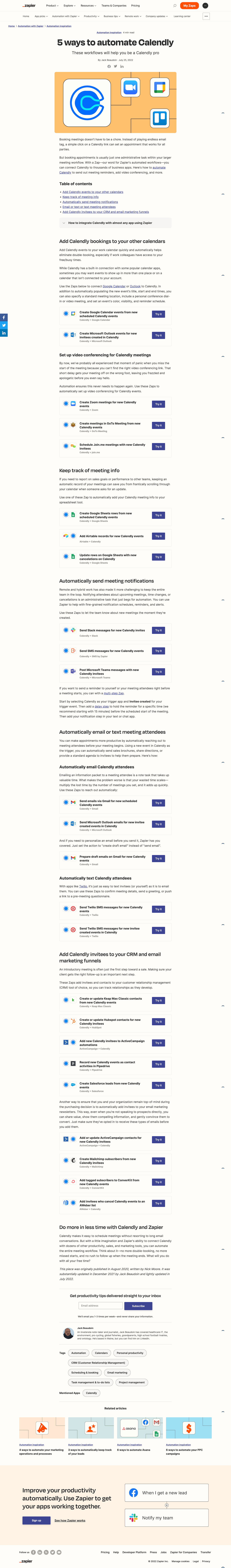 Calendly makes it easy to schedule meetings without resorting to long email conversations. But with a little imagination and Zapier’s ability to connect Calendly with dozens of other productivity, sales, and marketing tools, you can automate the entire meeting workflow. Think about it—no more double-booking, no more missed starts, and no rush to follow up when the meeting ends. What will you do with all your free time?