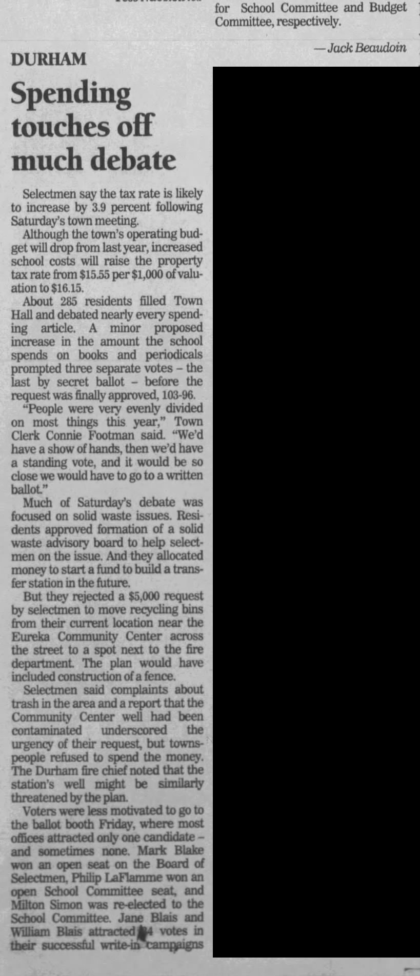 Selectmen said complaints about trash in the area and a report that the Community Center well had been contaminated underscored the urgency of their request, but townspeople refused to spend the money. The Durham fire chief noted that the station’s well might be similarly threatened by the plan.