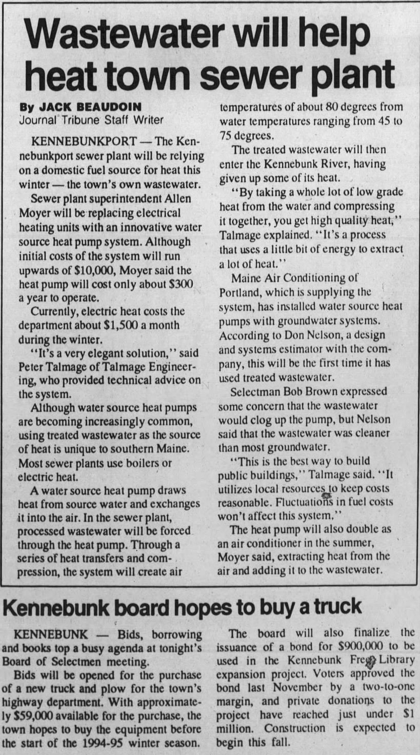 citation: “Wastewater will help heat town sewer plant” Newspapers.com, Journal Tribune, September 13, 1994, https://pressherald.newspapers.com/article/journal-tribune-wastewater-will-help-hea/128197786/